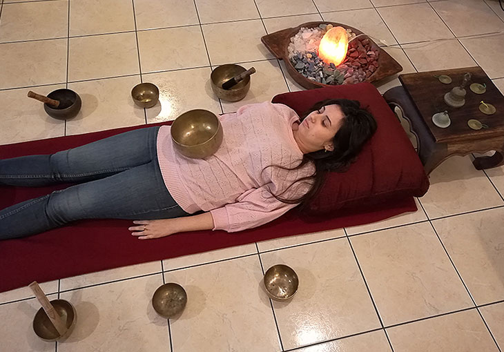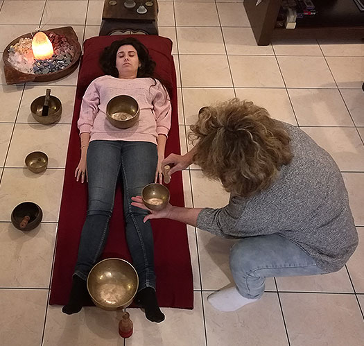 הטיפול מתבצע כאשר המטופל שוכב על גבו ואני מנגנת ומהדהדת על הקערות סביב למטופל וגם מניחה קערות על גופו.